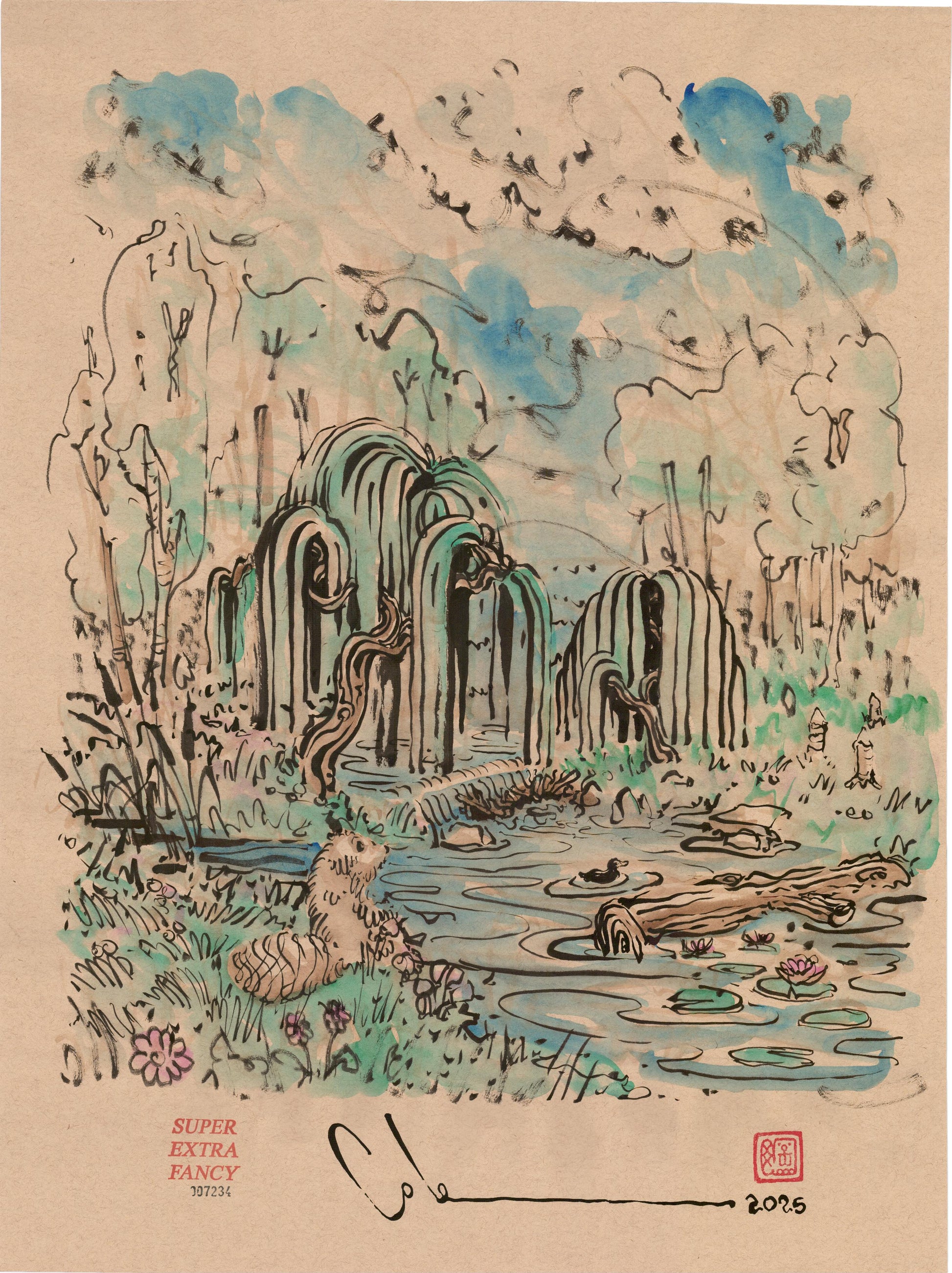 Super Extra Fancy Original Inkbrush Drawing! Wooden Hanger Frame Included!